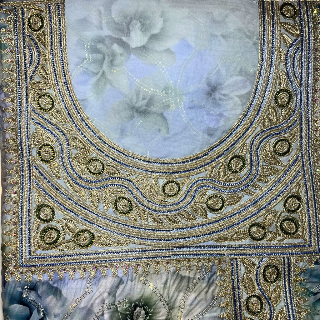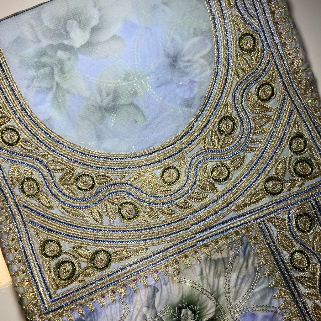 The Details Hand-selected Azure Blue Cotton featuring a serene tonal botanical print and a masterpiece of intricate embroidery. This ornate square and curved neckline is accented with shimmering beads, delicate sequins, and hand-applied circular accents. This is a premium, unstitched fabric provided as a canvas for bespoke tailoring.